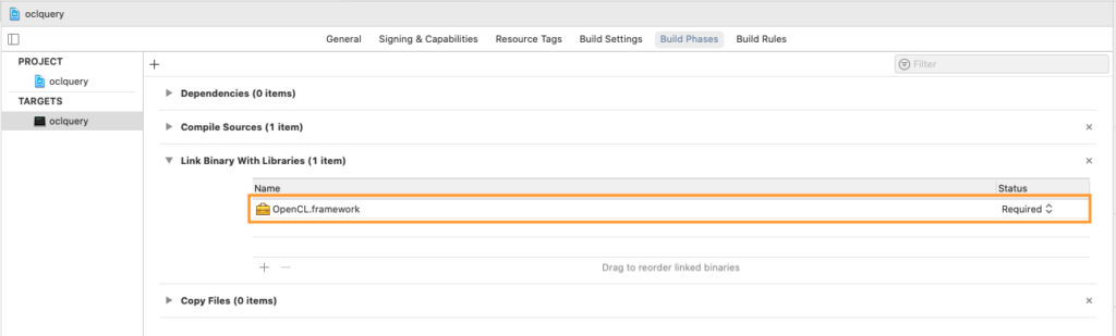 - Project를 선택하고 ‘Build Phases’ -> ‘Link Binary With Libraries’에서 더하기(+)를 선택한 후 OpenCL framework을 선택한다.