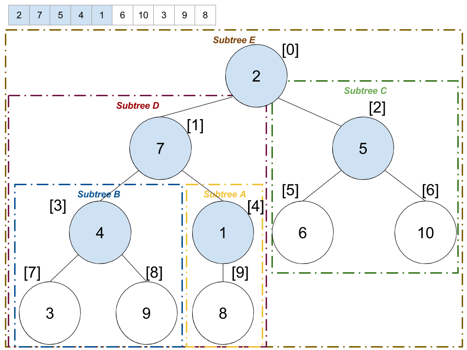 각 부모 node들과 자식 node들을 subtree라고 하면 이 예제는 다음과 같이 5개의 subtree들로 구분될 수 있다.
