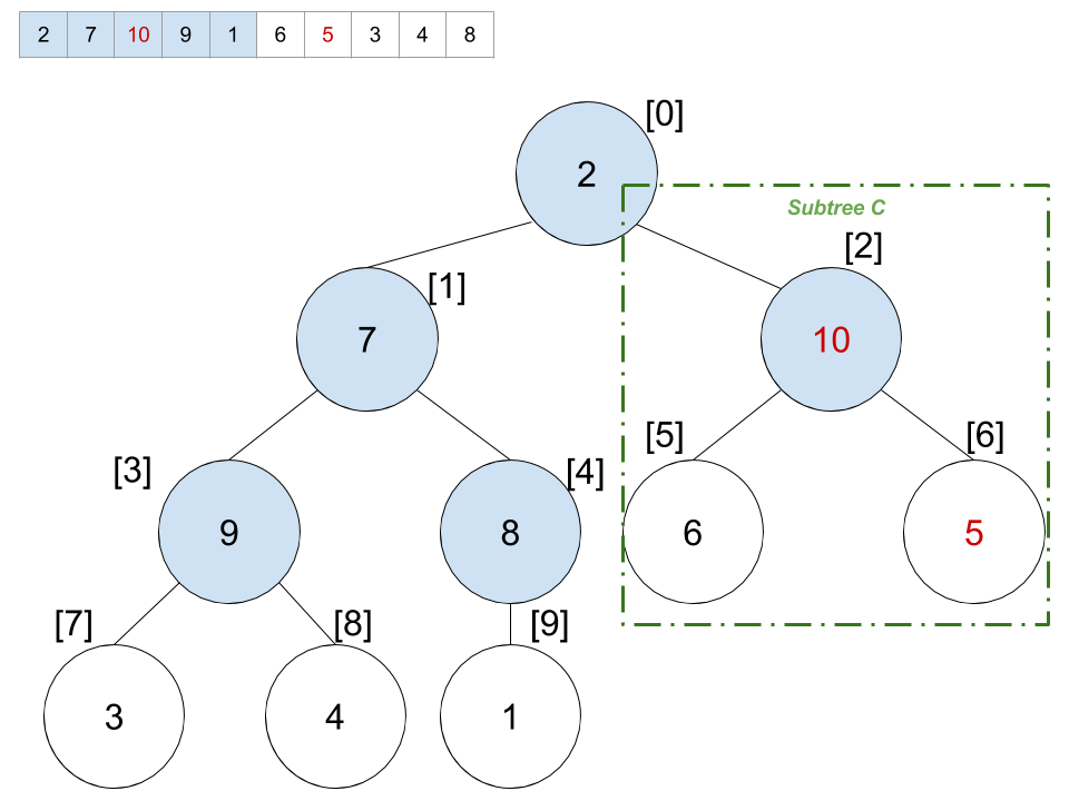 임의의 정렬되지 않은 배열 { 2, 7, 5, 4, 1, 6, 10, 3, 9, 8}을 예로들어 보자. 10개의 node를 가지는 tree를 배열로 구현 할 때, 부모 node들의 index는 소숫점_버림(N/2) – 1로 계산할 수 있다. 따라서 10개의 node를 가지는 이 tree의 부모 node들의 위치는 [0], [1], [2], [3], [4]이다. (C/C++로 구현 할때는 N/2한 값을 그냥 int형 변수에 넣으면 된다)